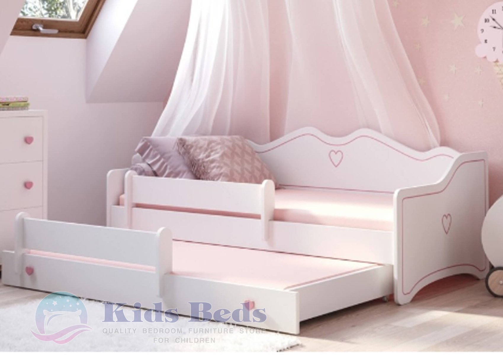 The Emma double bed is an extremely original piece of furniture with an original shape that every little princess will love at first sight. High-quality materials and perfect finishes guarantee durability and safety of use. Thanks to the safety barriers, you as parents can feel safe when your children sleep on a new bed.